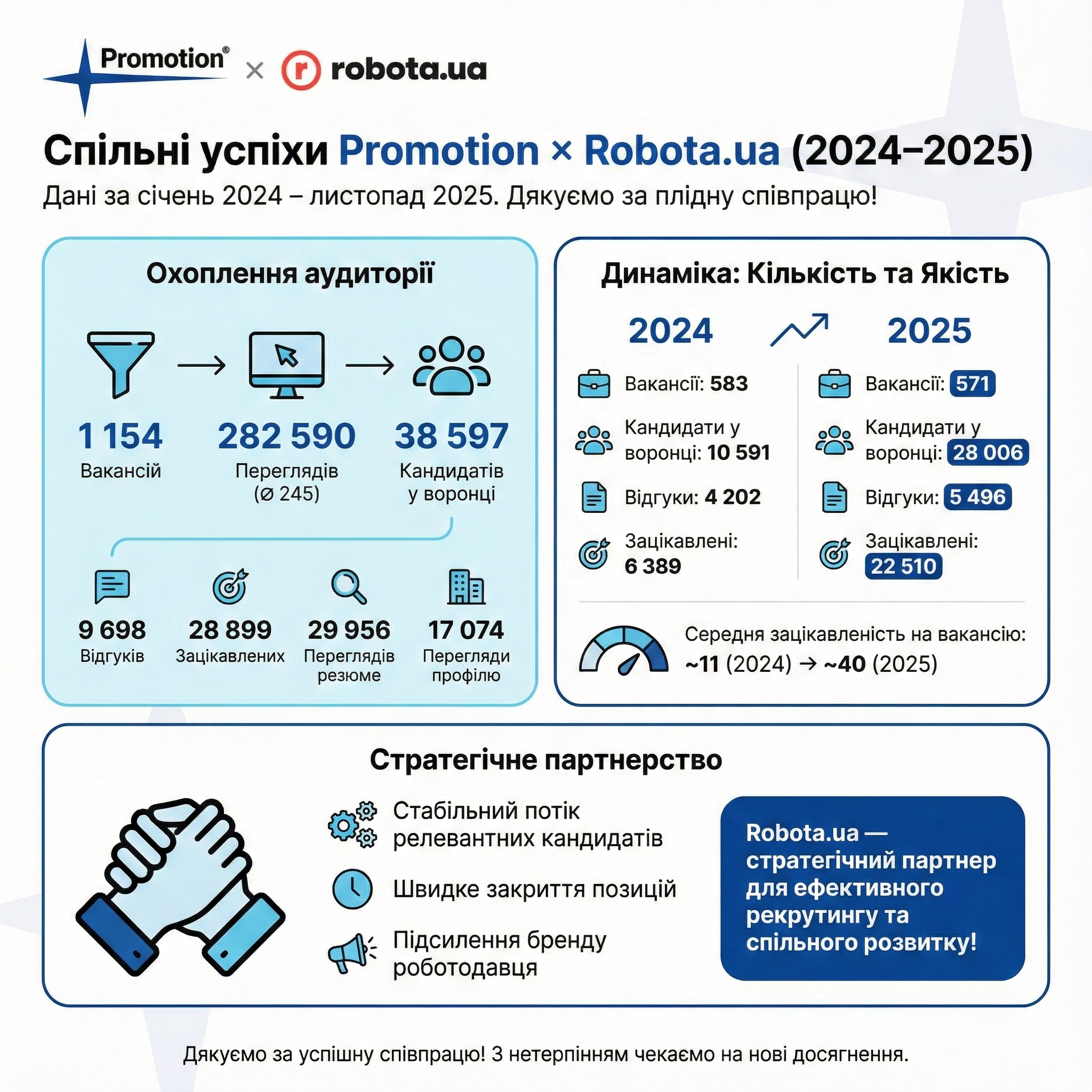 Ми в Promotion хочемо висловити щиру вдячність нашому надійному партнеру — платформі Robota.ua — за плідну та високоефективну співпрацю протягом останніх двох років (2024–2025 рр., дані за період січень 2024 – листопад 2025).